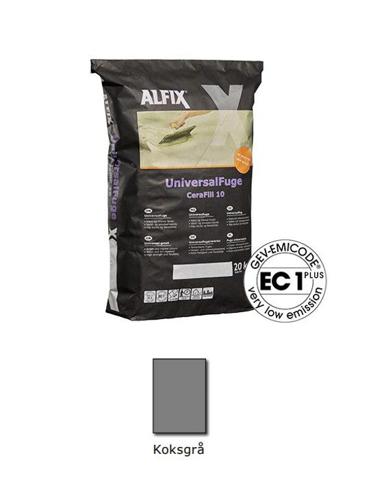 Alfix UniversalFuge – CeraFill 10 er en cementbaseret, kunststofforstærket fugemasse med lysægte pigmenter. Den er velegnet til fugning af keramiske fliser, klinker, mosaik og natursten med moderat eller lav sugeevne.