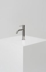 Bundventil i poleret rustfrit stål, der matcher håndvaskarmaturets farvevalg.