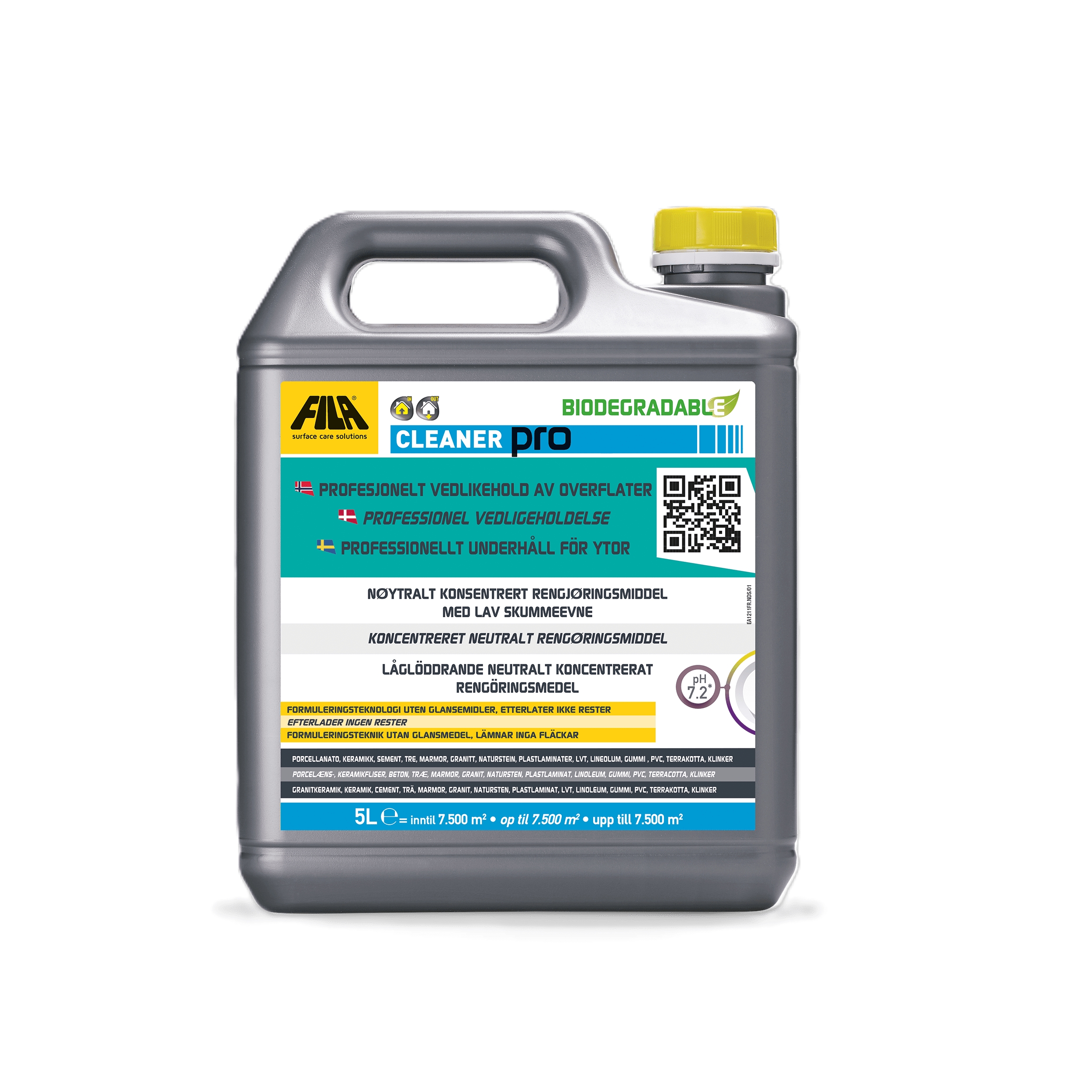 Cleaner Pro er et alsidigt rengøringsmiddel, der er designet til at rengøre skånsomt og effektivt på alle typer gulve og vægbeklædninger. Det er særligt velegnet til brug på behandlet og sart materiale som natursten med poleret finish, hvor kraftige rengøringsmidler kan skade overfladen. Produktet er også uundværligt til rengøring efter lægning af gulve og til vedligeholdelse af overflader i både hjem og kommercielle miljøer.