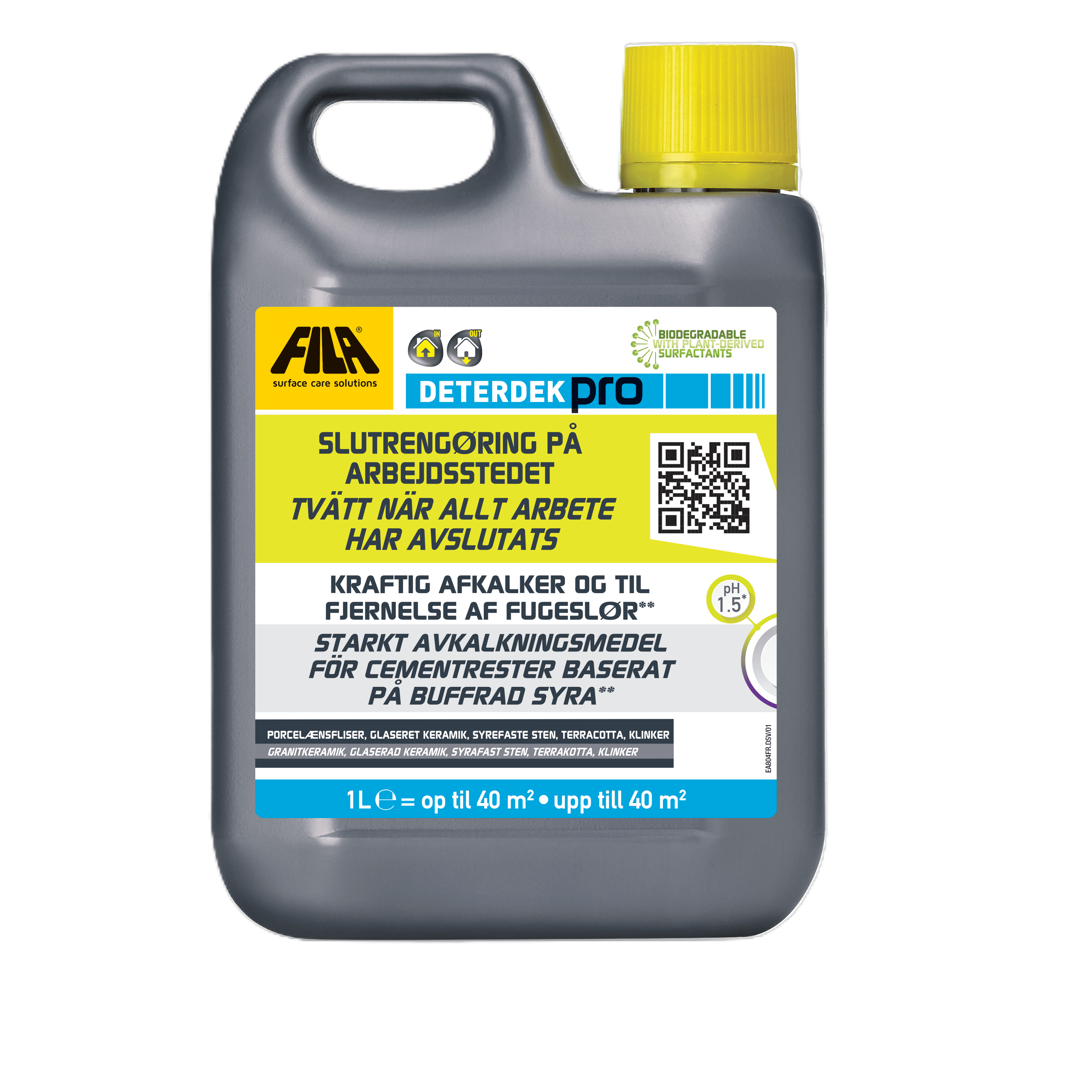 Deterdek Pro er det ideelle valg til slutrengøring efter byggeprojekter. Det fjerner effektivt fugeslør og genstridigt, uorganisk snavs, samt kalkaflejringer og saltudtræk fra teglsten. Perfekt til rengøring af både gulve, vægge (som brusenicher) og sanitære installationer. Dens afkalkende egenskaber gør den også yderst velegnet til udendørs belægninger. Takket være dens overfladeaktive stoffer sikrer den dybderengøring uden at skade materialerne og efterlader ingen spor af rust eller kalk.